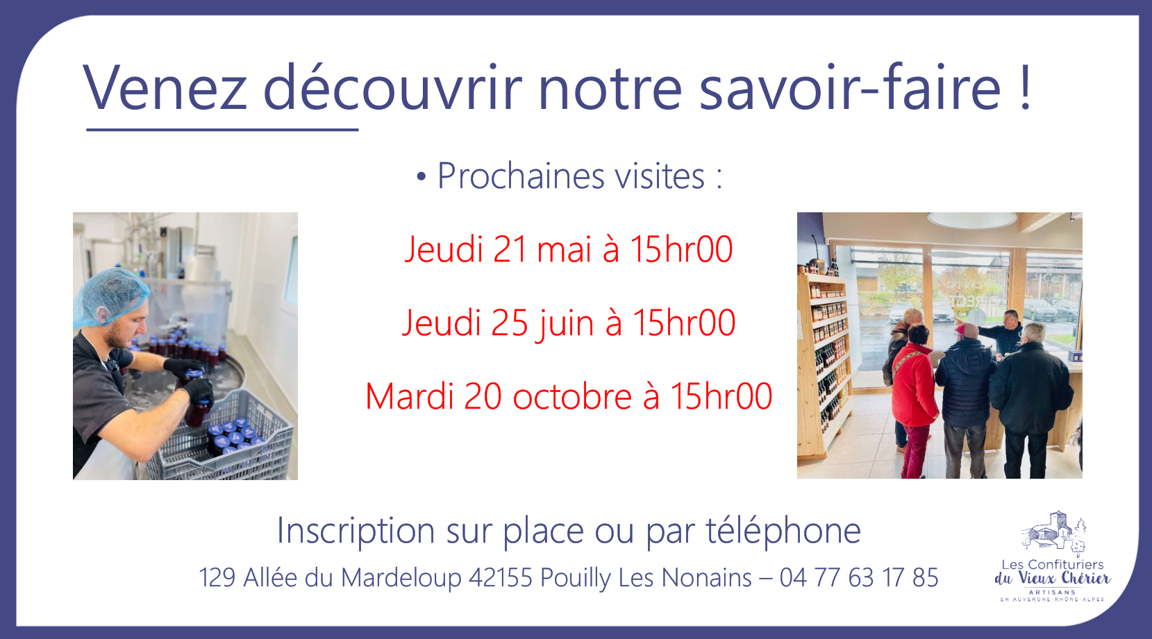 « La belle histoire » commence en 1993 au coeur des Monts de la Madeleine, à 800m d’altitude... Cette année là, nous nous installons comme producteurs de fruits à CHERIER près de ROANNE (42 - Loire en Auvergne-Rhône-Alpes). En 2003, le succès croissant de nos recettes et la demande d’autres parfums ne nous permettent plus d’être « aux plantations et aux bassines ». Nous devenons alors artisans confituriers et, riches de notre expérience, nous nous consacrons entièrement à la transformation des fruits. Nous sommes fiers de vous faire découvrir nos produits et une équipe passionnée à votre service.